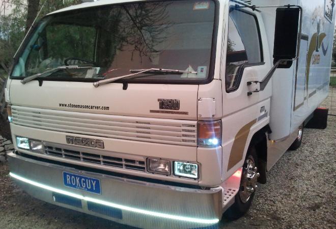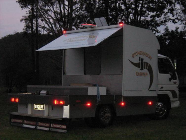 | 1992 0409 FORD TRADER HALF MOTORHOME ROCGUY Primary use.. Intrastate stone and accomodation hauler THE ENGINE..using the same economical 3.5 ltr 4 cylinder diesels running on B20 bio-diesel which is a 20% blend of vegetable/diesel. B50 being used where its avaliable. BODYWISE... Completely rebuilt from the chassis up after being used as a city delivery pantec. The short tray is custom built by myself to include a 75mm tow ball able to pull a lightweight gooseneck trailer I use and a rear winch for pulling stones. Stainless steel trim is used extensively throughout with alloy sheet side skirts covering around the wheel openings. There's over 160 LED lights fitted externally adding to the much needed bling. Stainless steel wheel insert are also added. INTERIOR...The 60in custom sleeper I built features all the conveniences of the larger motorhome but without a shower. It also is 12v solar powered to run all the normal appointments.Cab appointments have further been upgraded. The sleeper is built using a sandwich method of face recycled plywood interior and alloy Violet tone cargosheet externally giving great insulation all year round. |