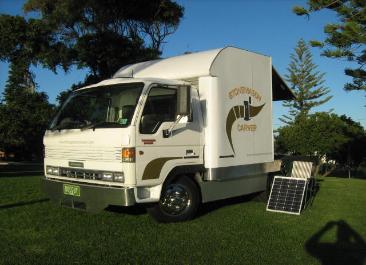 | 1991 MAZDA T3500 CUSTOMISED MOTORHOME ROKGUY Primary vehicle... used Interstate and Onsite THE ENGINE... An economical 3.5 ltr 4 cylinder diesels running on B20 bio-diesel which is a 20% blend of vegetable/diesel. B50 being used where its avaliable. BODYWISE... The motorhome was resurrected from a '91 Mazda cab/chassis and fitted with a customised pantec body, luckily the two smaller windows at the front were already there, the other windows sourced as seconds from a caravan dealer in Albury NSW. The side cladding is cargo sheet, though aluminium it is UV stabilised and won't need replacement like filon fibreglass (delaminates) All outside lighting (BLING) is efficient LED. INSIDE...Accommodation inside is all solar 12 volt DC powered, the solar cells are 64watt Uni-solar (amorphous ,shade tolerant). All lighting is strip LED (1/10th the power consumption) TV, stereo, DVD, computer, fridge, solar shower, phone and camera are run via this system. A waterless toilet using zeolite is fitted as is a metho burning stove to lower co2 emissions. The interior was fitted out using as much recycled and recyclable material as possible. |